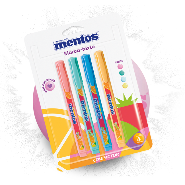 Falando em traços, o Marca-texto Destaq | Mentos veio para iluminar seus dias com cores intensas e um aroma delicioso. Com uma ponta chanfrada que desliza suavemente sobre o papel, ele destaca informações importantes com estilo. O design anatômico em formato “D” é inovador e ergonômico, proporcionando uma experiência única de uso. E com o toque especial de Mentos, suas anotações ganharão um charme extra.
